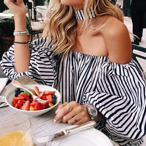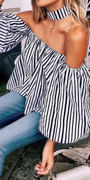 puff sleeves,sweet yet feminine. Decorated with a striped choker makes it look more attractive. Try to pair