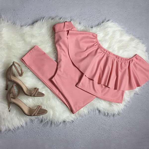including an off-shoulder boat neck ruffle crop and a high waist tight pants,this two-piece set is a good way to showcase