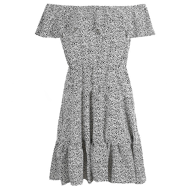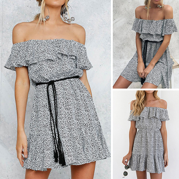 Dots printed design gives you a playful and energetic style,while the off-shoulder boat neck and ruffle hem design