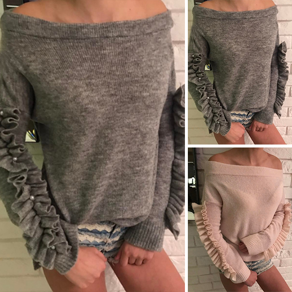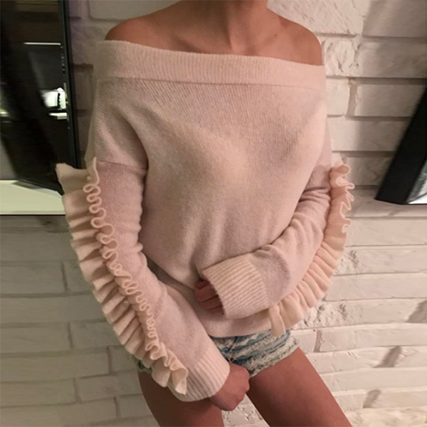 Sexy Off-shoulder Boat Neck Ruffle Long Sleeve Solid Color Sweater