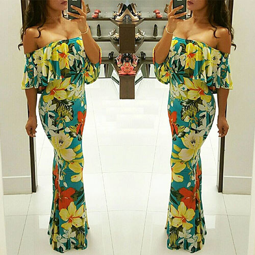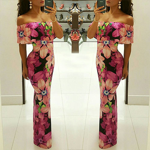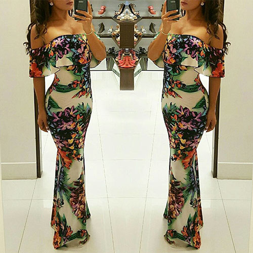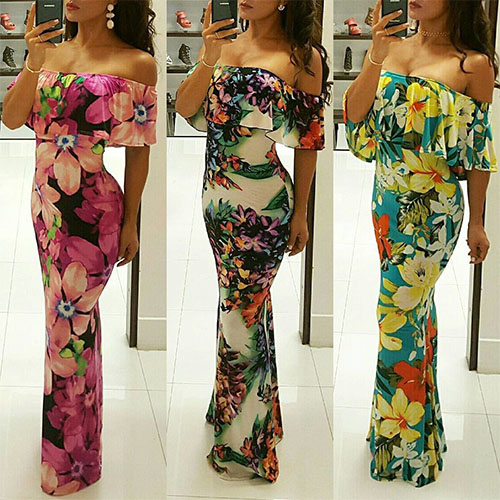 Boasts vibrant and romantic floral print,its off-shoulder boat neck with ruffle design can give you a more appealing