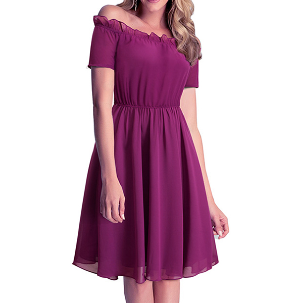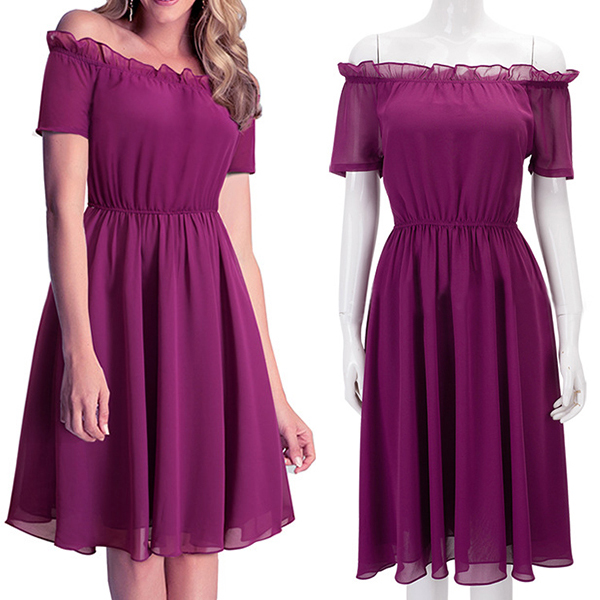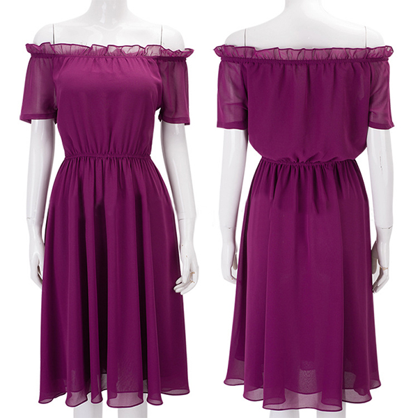 purple tone,accompanied with off-shoulder wide neckline design can better showcase your female appeal,while its elastic