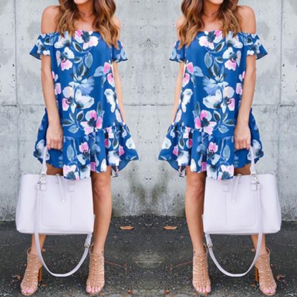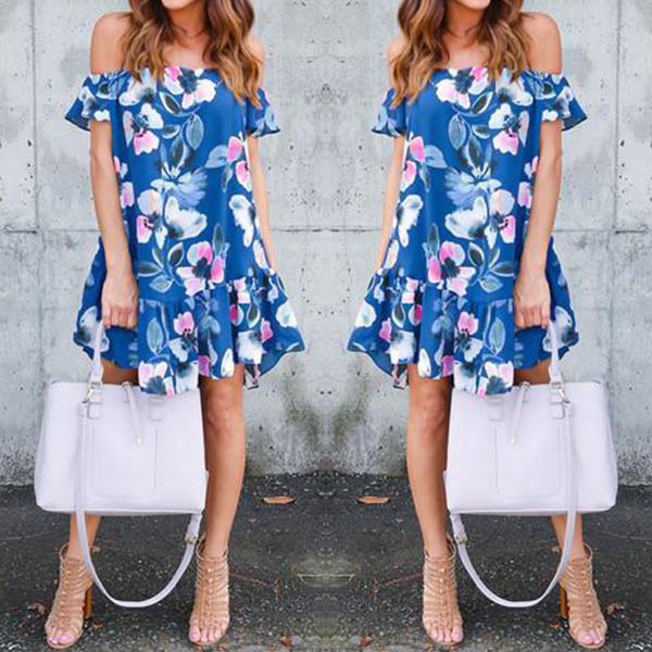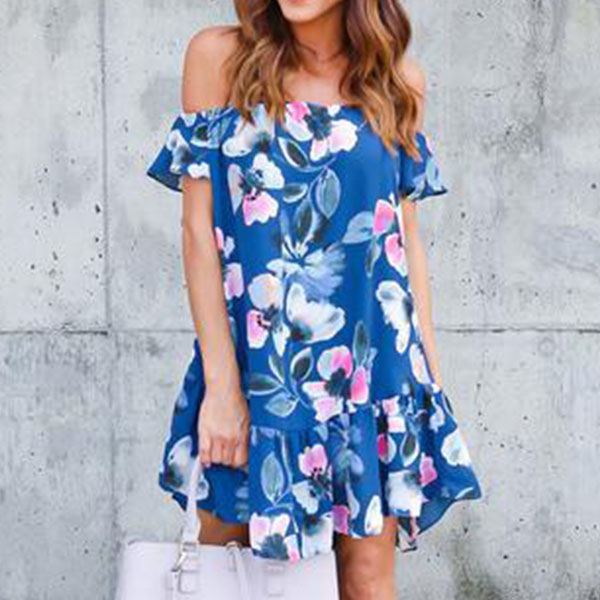 Sexy Off-shoulder Boat Neck Short Sleeve Printed Dress