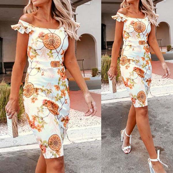 focused on this one! This printed dress comes with an off-shoulder boat neck,finished with a fit