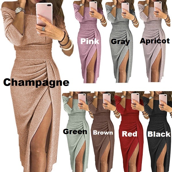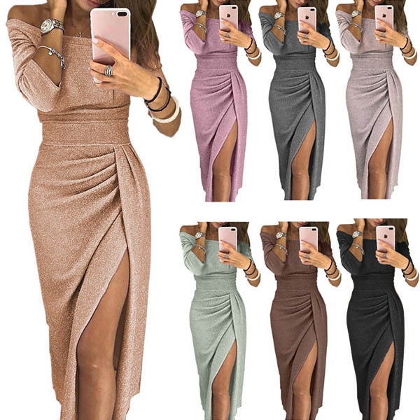 The off-shoulder boat neck and slit hem design make this piece look so sexy and alluring,