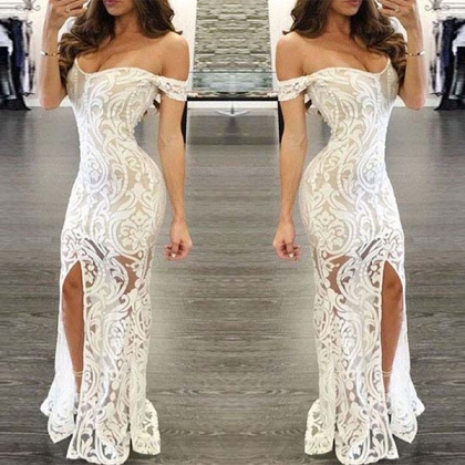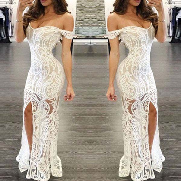 your eyes focused on this lace dress. The off-shoulder boat neck and slit hem design make this