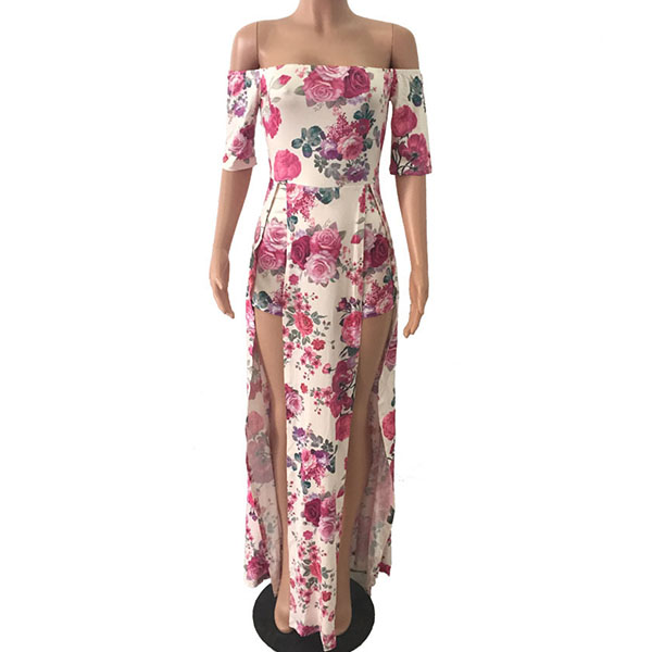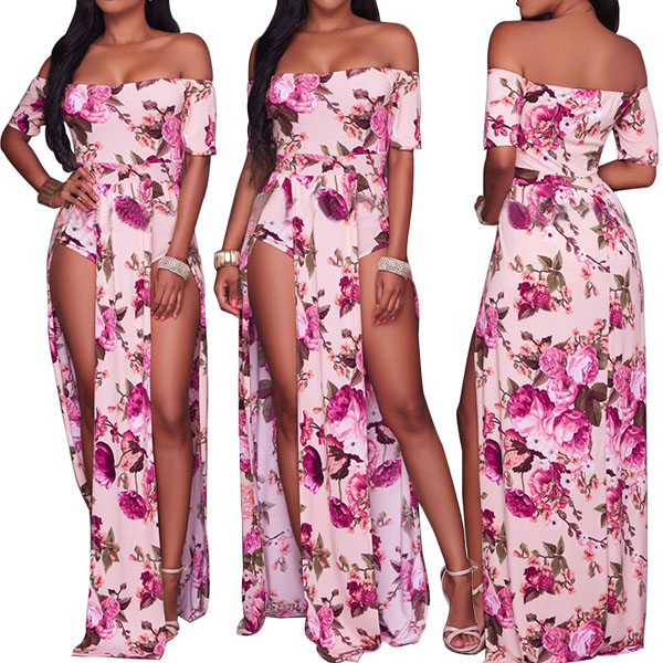 Thought it is a dress? No,it is a romper! Boasts romantic and vibrant floral print,designed with an off-shoulder wide neckline,