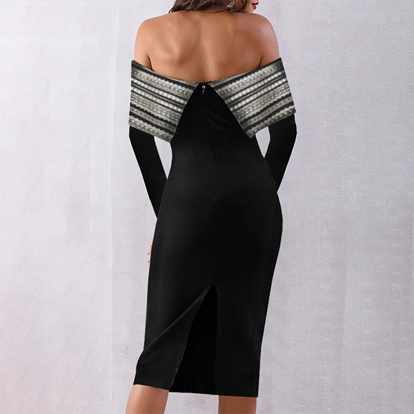 Sexy Off-shoulder Boat Neck Slit Hem Slim Fit Printed Dress