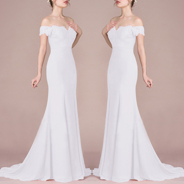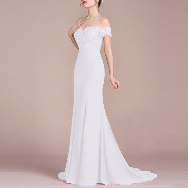 elegant vibe,while the off-shoulder boat neck and floor-length hem design make this piece look more