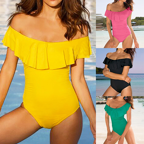 swimsuit. Solid color style,its off-shoulder boat neck and ruffle design makes this piece