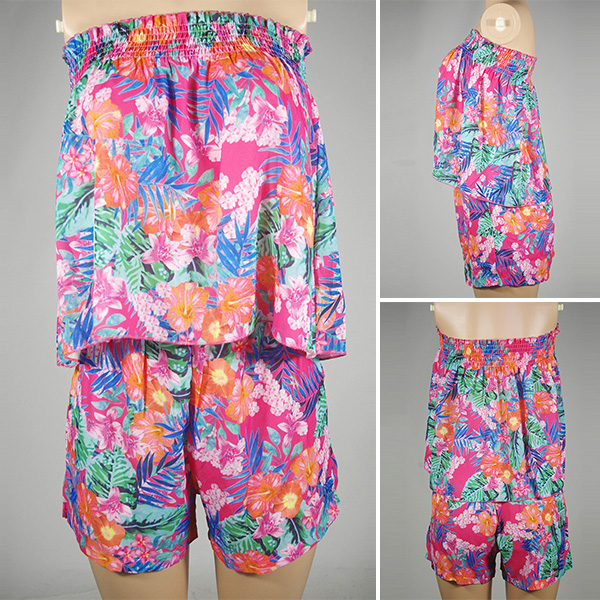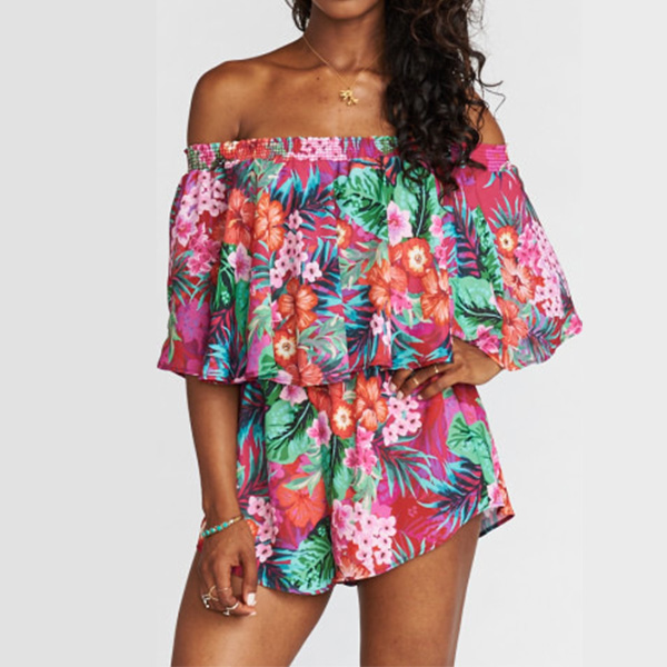 Boasts eye-catching and vibrant floral print,including an off-shoulder boat neck top and a high waist shorts,this two-piece