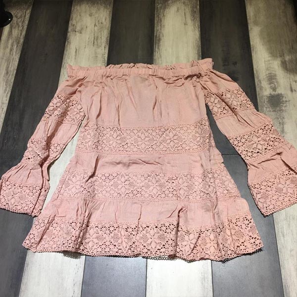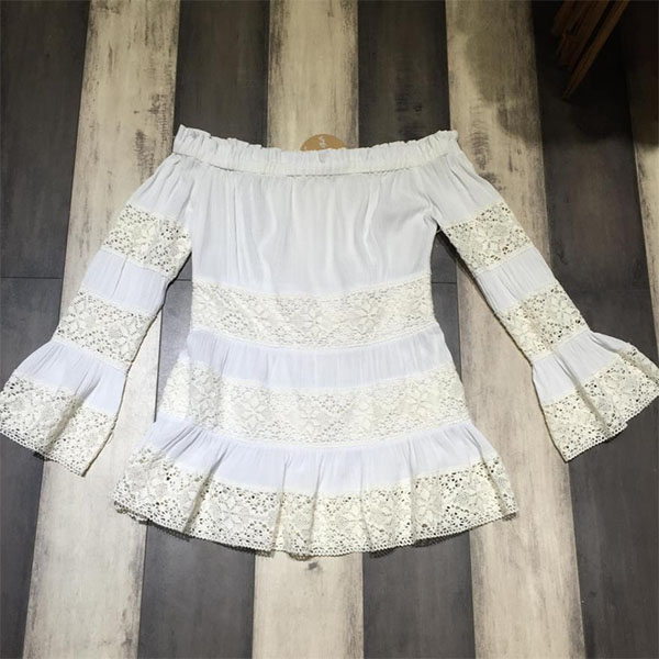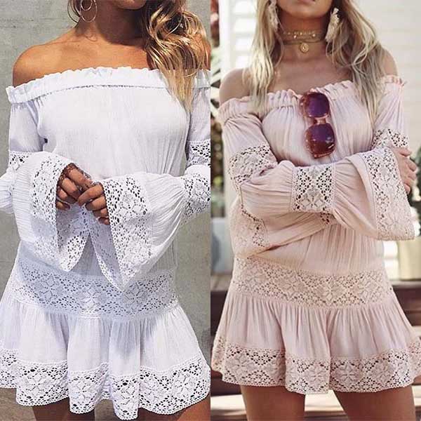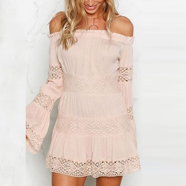 The off-shoulder boat neck,trumpet sleeve and lace spliced design will further boost your feminine appeal.