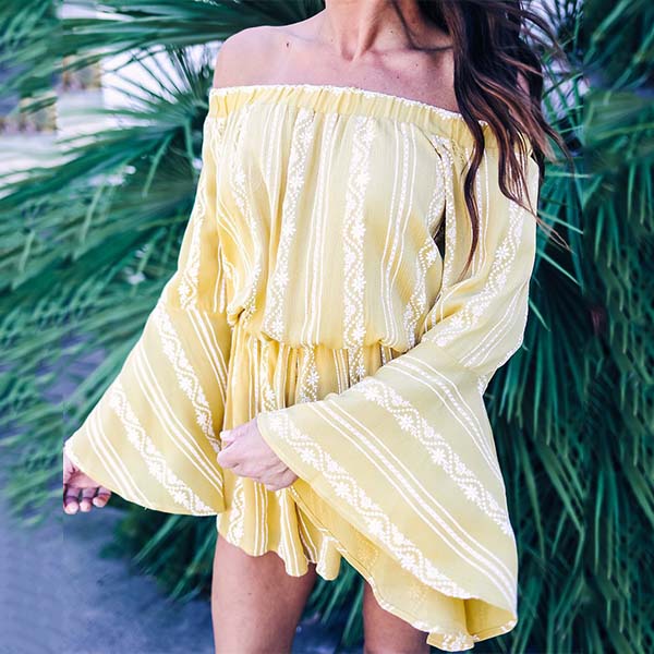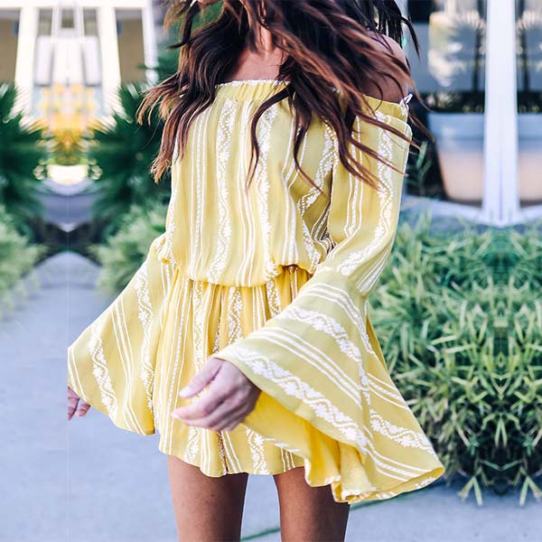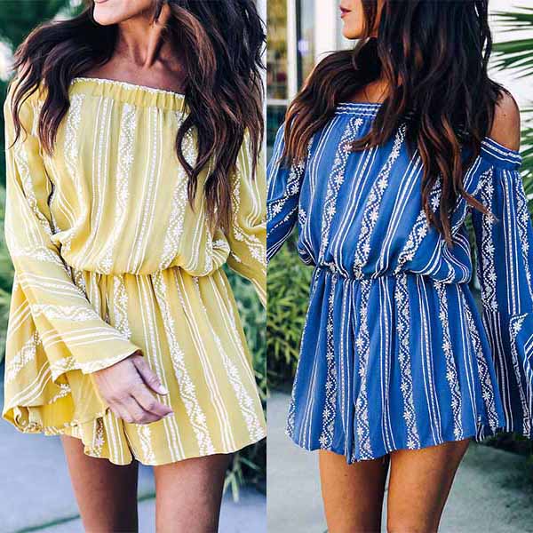 It is styled with ff-shoulder boat neck,trumpet sleeve and an elastic waist,this dress definitely knows how