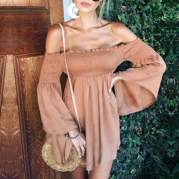 Comes with a solid color,the off-shoulder boat neck and trumpet sleeve design are the highlights,which can offer
