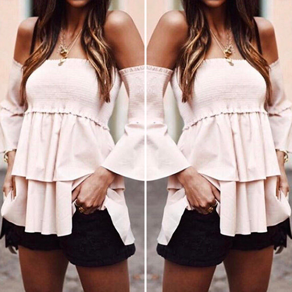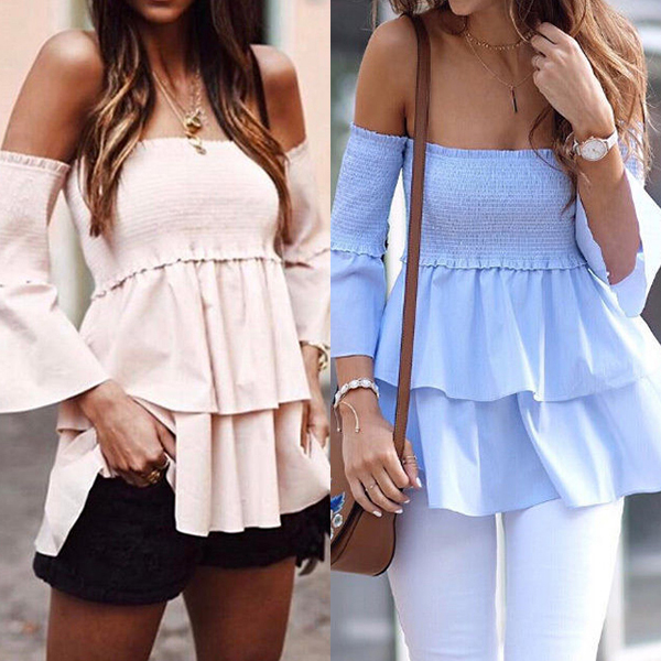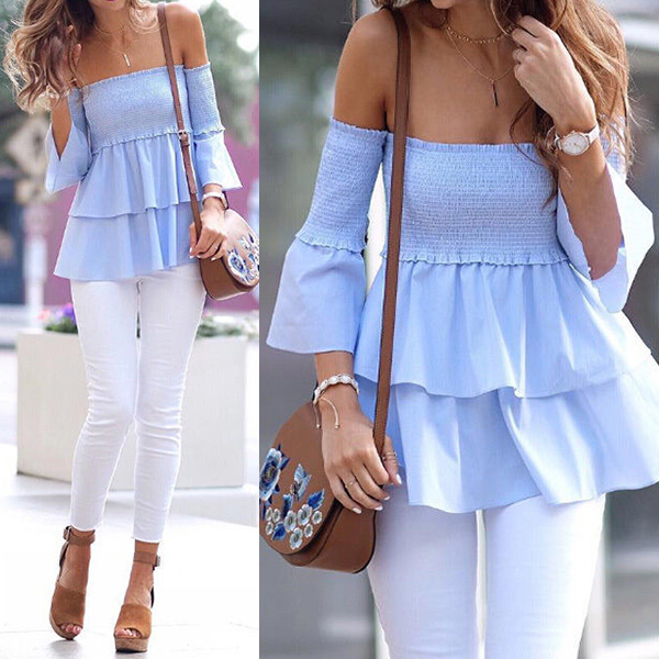 Add a dash of feminine appeal to your wardrobe ensemble with the help of this piece. Solid color style,its off-shoulder wide
