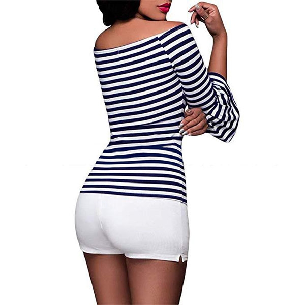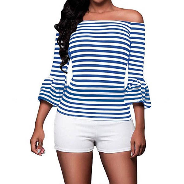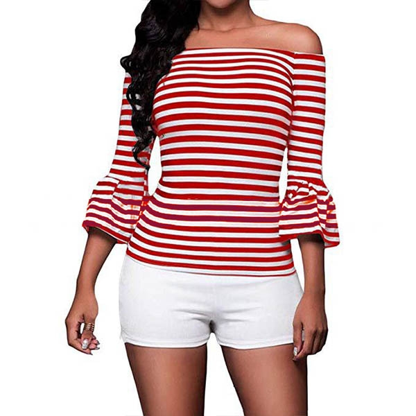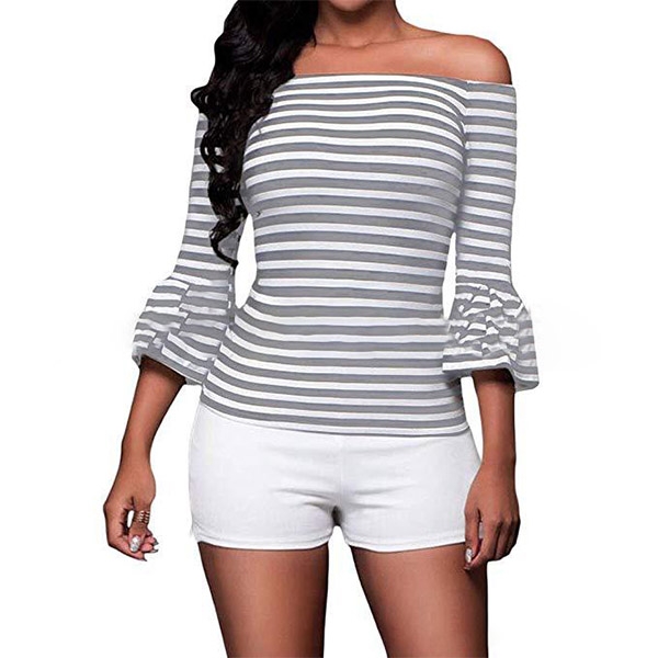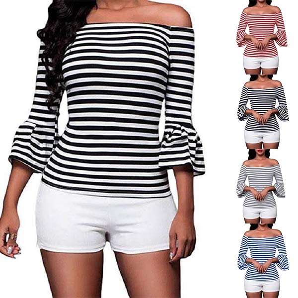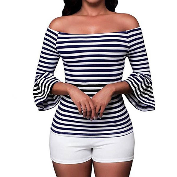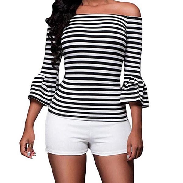 striped element,the off-shoulder boat neck and trumpet sleeve design make this piece look so sexy