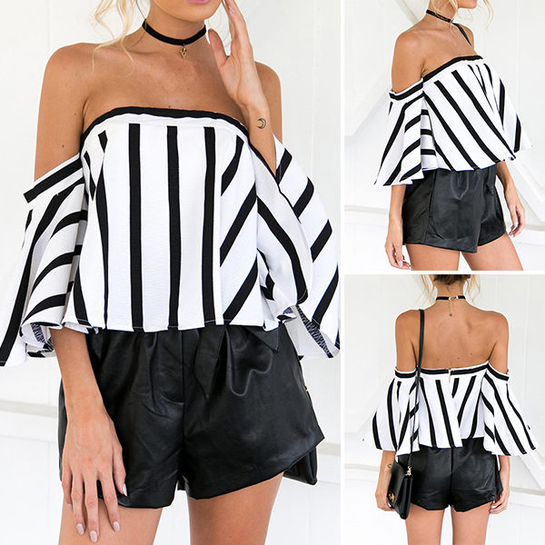 Easy to achieve for a feminine and sexy look with the help of this striped top. Striped style,designed with off-shoulder boat neck
