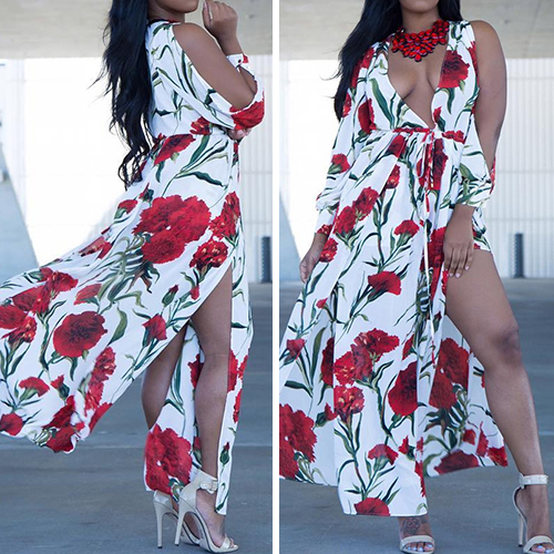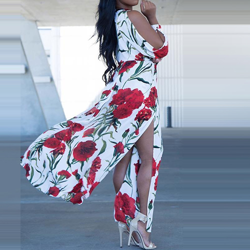 patterns provide a dreamy and romantic vibe,while its off-shoulder,deep v-neck and high slit hem design gives you