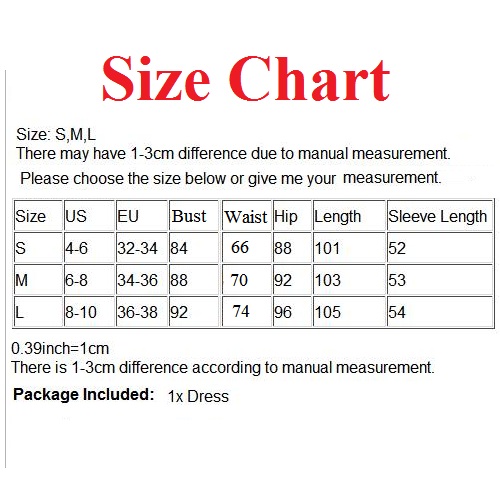 S : Bust : 84cm(33.07"); Waist : 66cm(25.98"); Hips : 88cm(34.65"); Sleeve : 52cm(20.47"); Length : 101cm(39.76");
