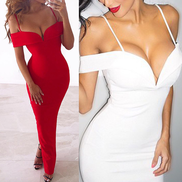 this dress! This sling dress boasts an elegant solid color tone,accompanied with off-shoulder and deep v-neck design,