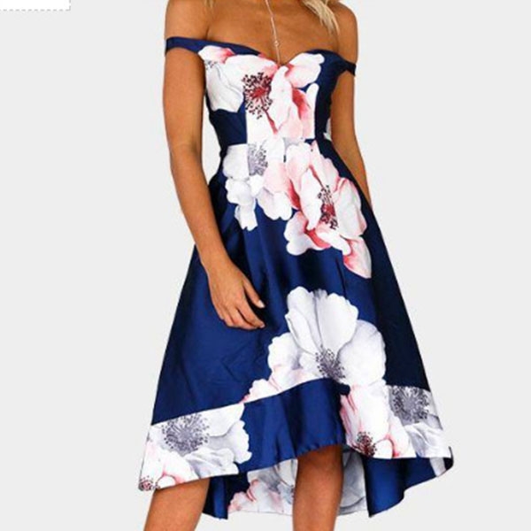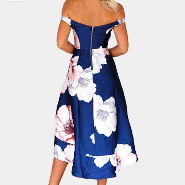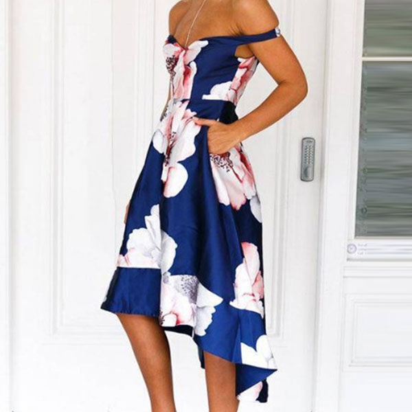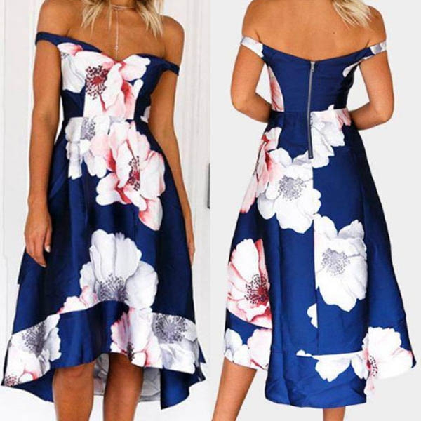 eye-catching printed details,the off-shoulder and high-low hem design will make this piece