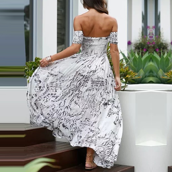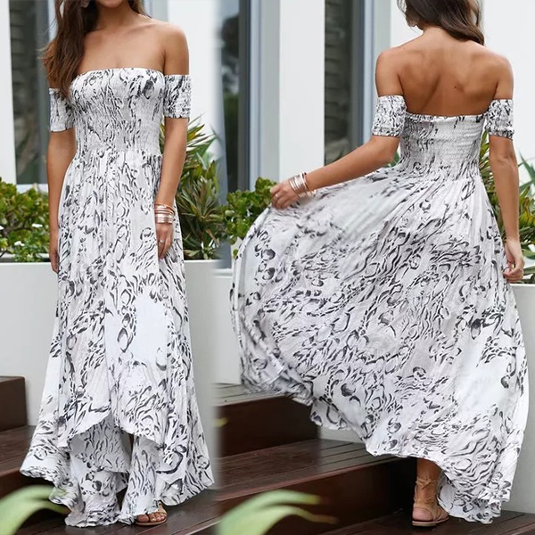 printed pattern,accompanied with off-shoulder,high waist and an irregular hem,this dress is a good way to demonstrate