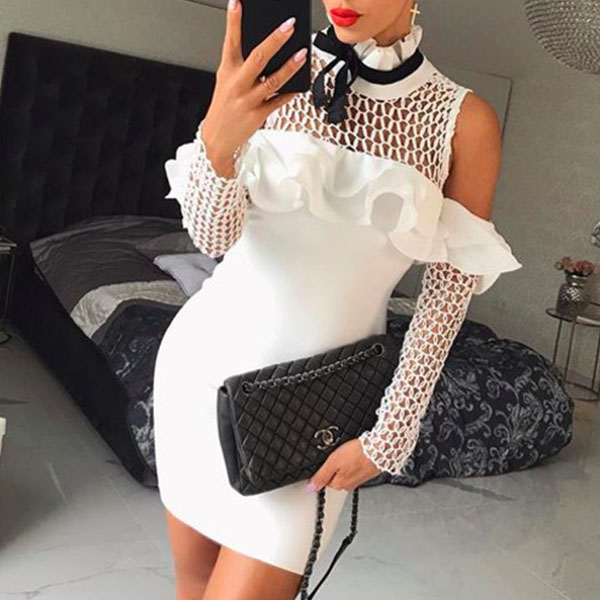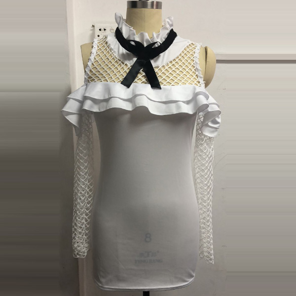 hollow out gauze spliced and ruffle stand collar design make this piece look so sexy and seductive.