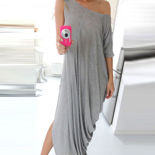 Ever seen such a chic and unique dress? Solid color style,its off-shoulder,irregular hem with