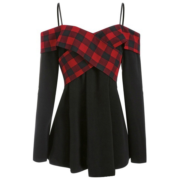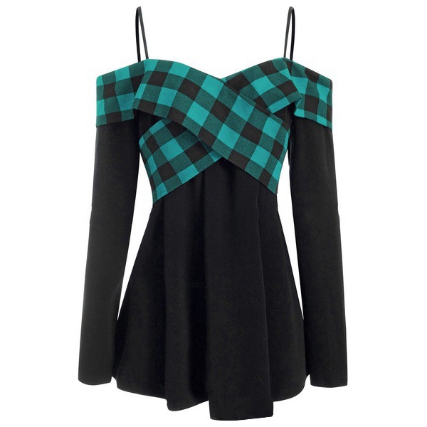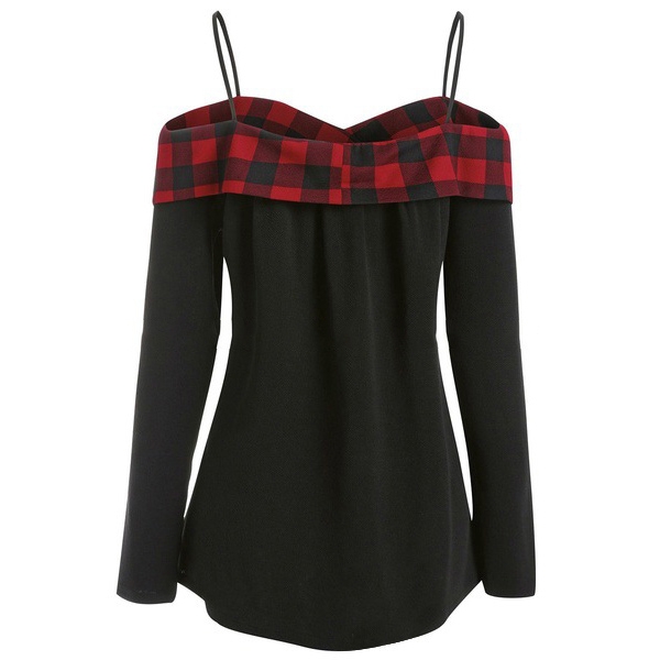 Sexy Off-shoulder Long Sleeve Plaid Spliced Sling Top
