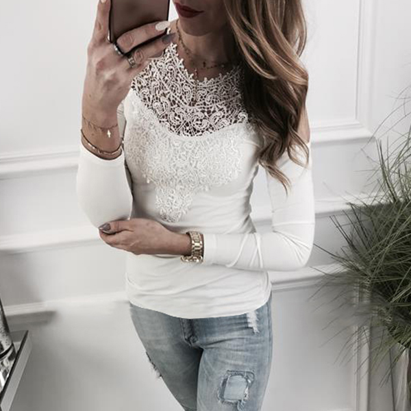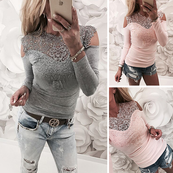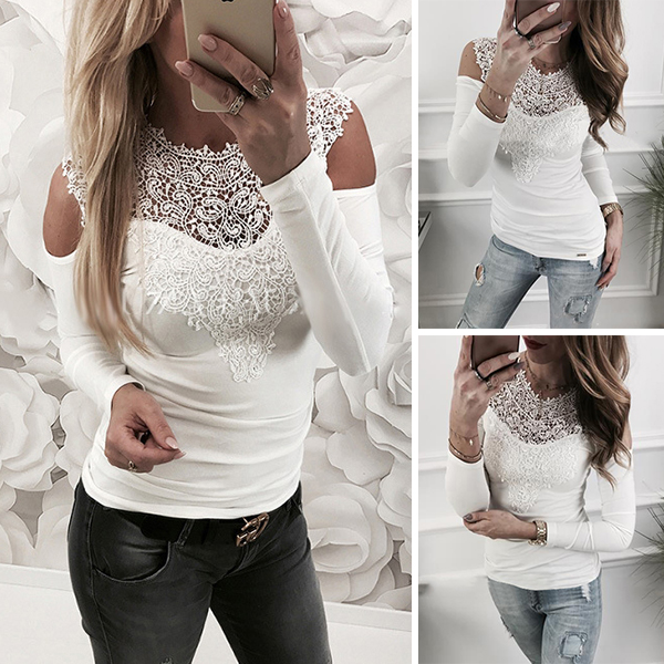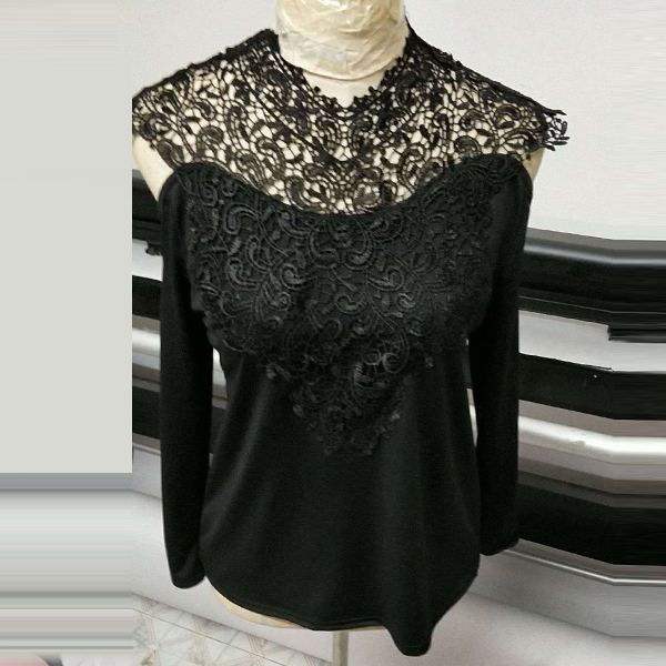 Sexy Off-shoulder Long Sleeve Round Neck Lace Spliced T-shirt (It falls small)