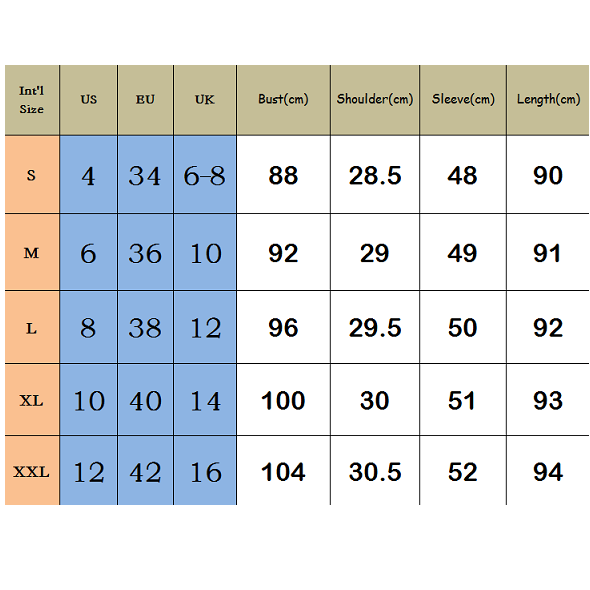 XL : Bust : 100cm(39.37"); Shoulder : 30cm(11.81"); Sleeve : 53cm(20.87"); Length : 93cm(36.61");