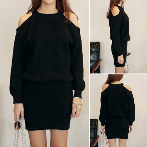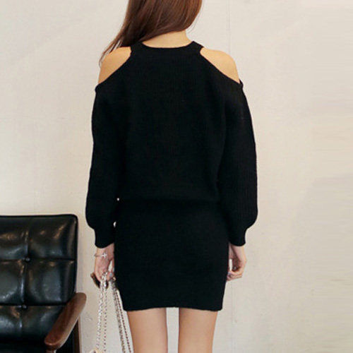 Sexy Off-shoulder Long Sleeve Round Neck Solid Color Knit Dress
