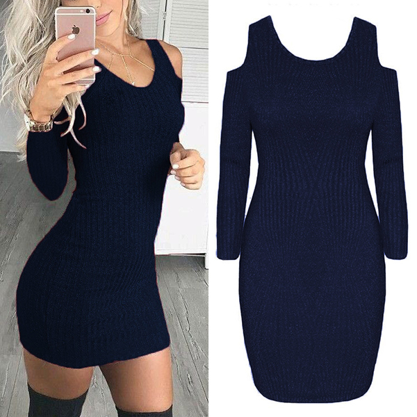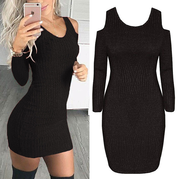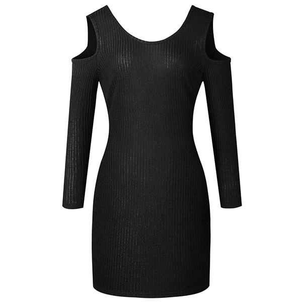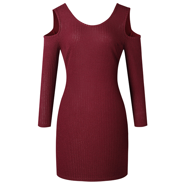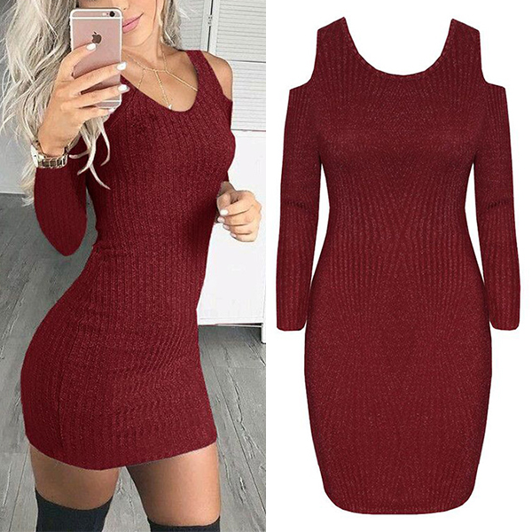 Sexy Off-shoulder Long Sleeve Round Neck Solid Color Tight Knit Dress