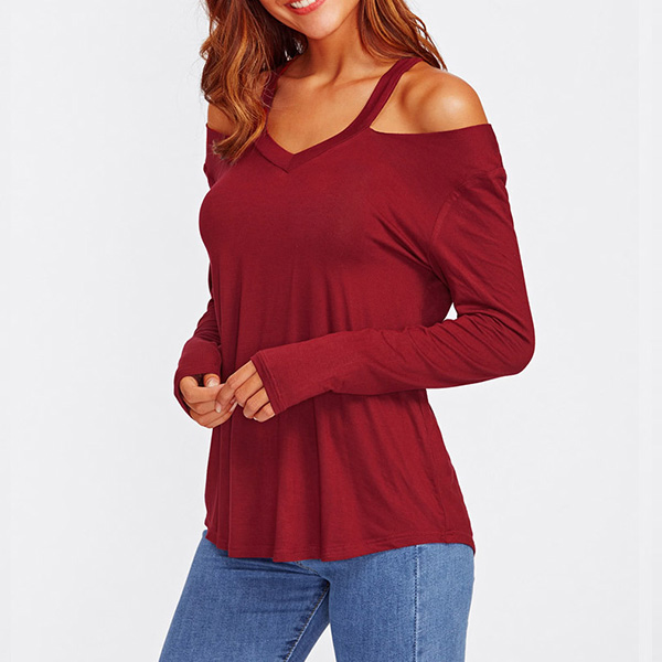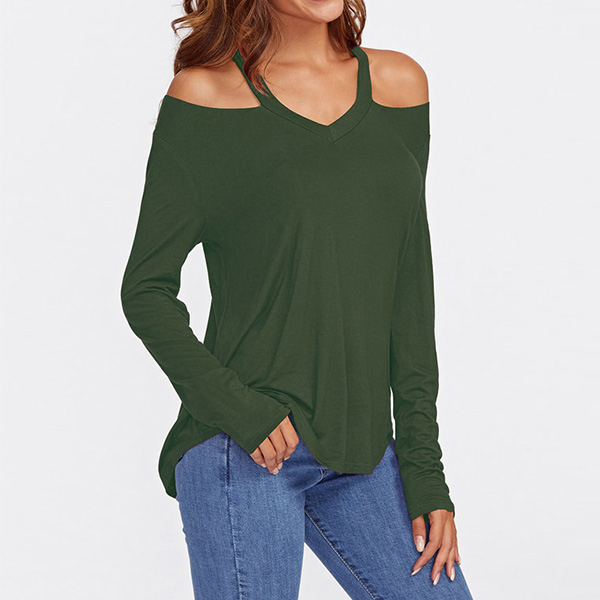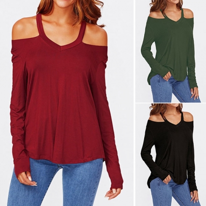 Cozy yet sexy,this is what this t-shirt can offer you! Solid color style,the off-shoulder and unique halter design
