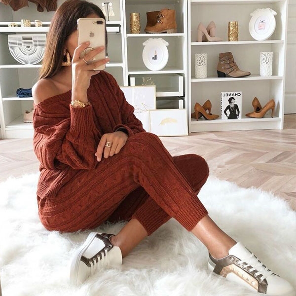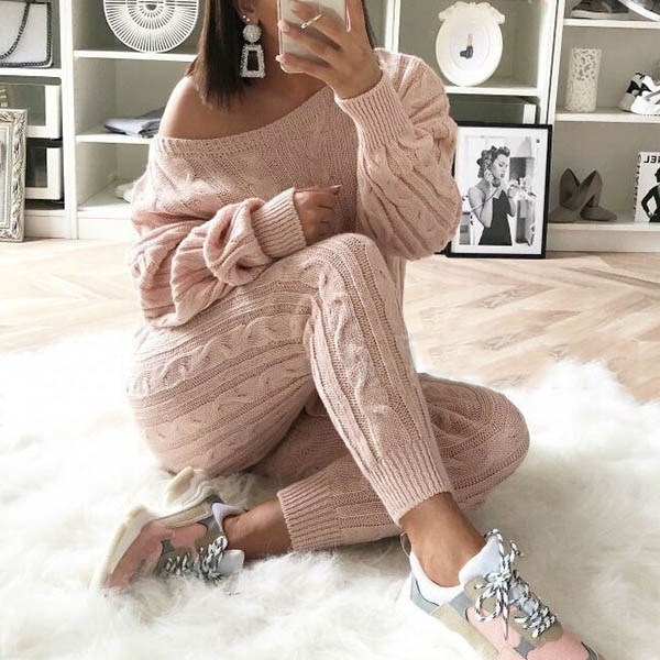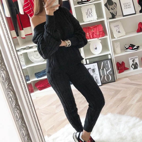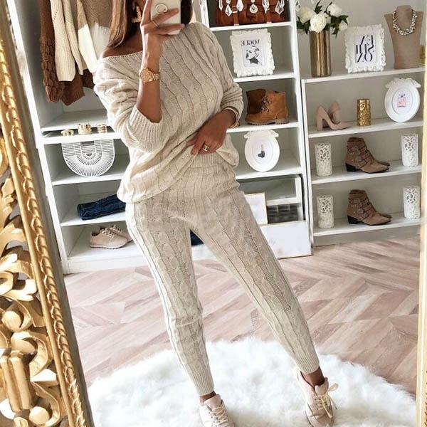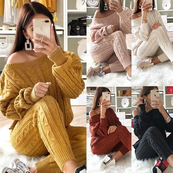 including a long sleeve off-shoulder sweater and a high waist knit pants,this two-piece set can keep you