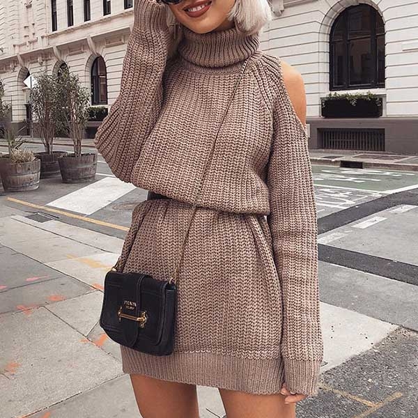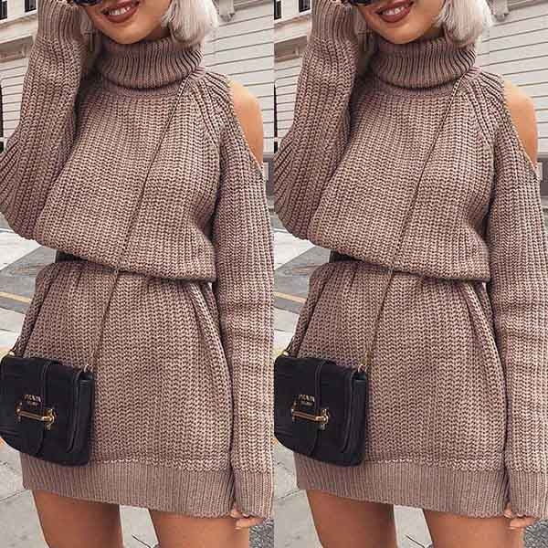 Sexy Off-shoulder Long Sleeve Turtleneck Solid Color Sweater Dress