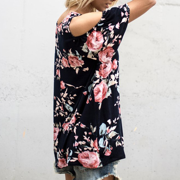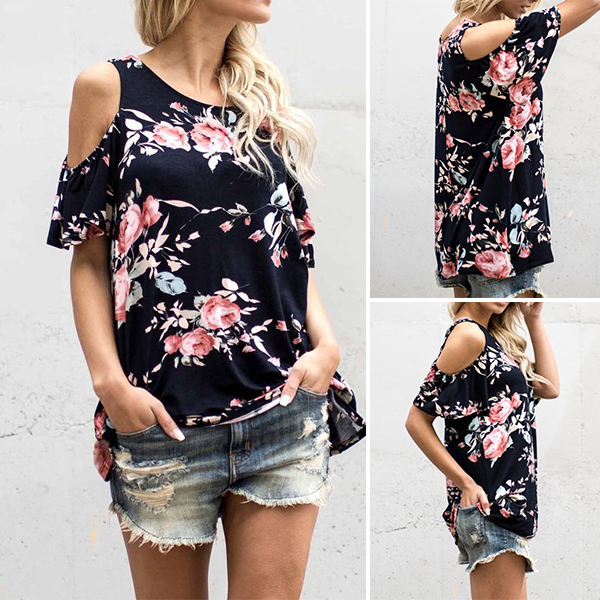 Cozy yet feminine,that's what this t-shirt can offer for you! Boasts vibrant and eye-catching floral print,with off-shoulder lotus sleeve,