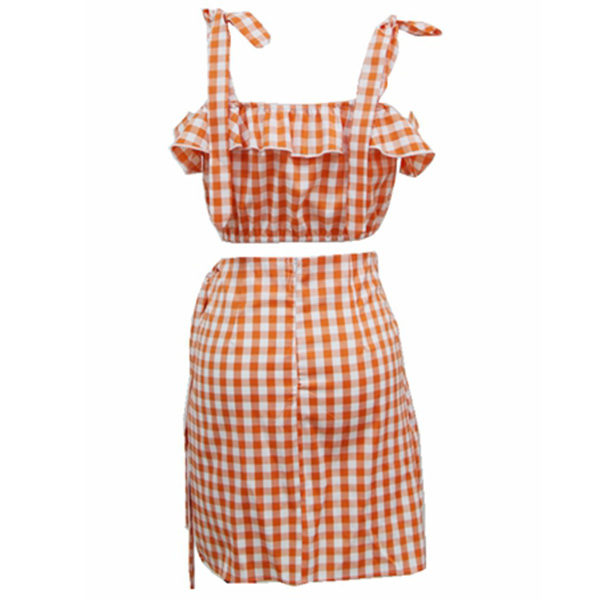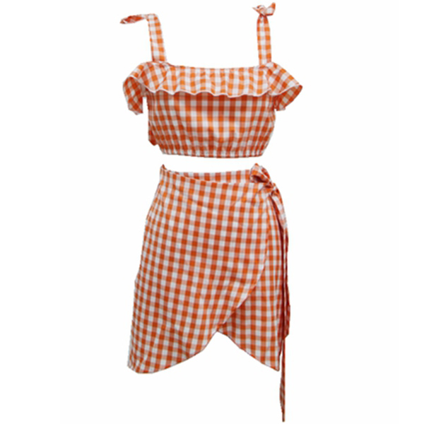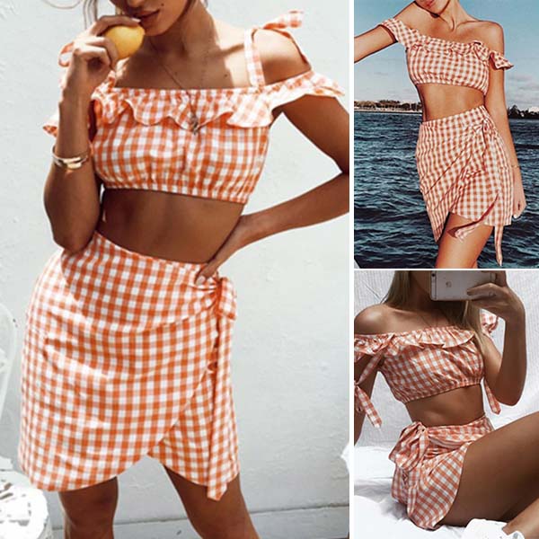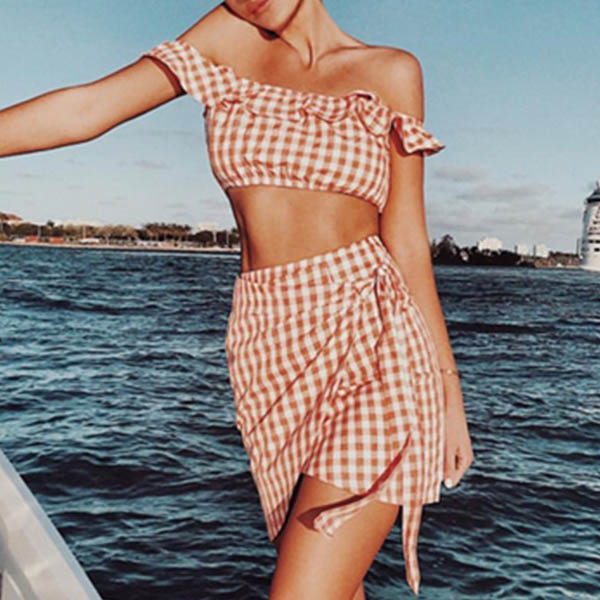 Plaid style,including an ff-shoulder bandeau top and a high waist irregular hem skirt,this two-piece set of