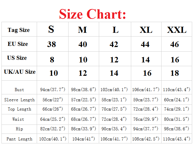 Tops Length : 66cm(25.98"); Pants Length : 102cm(40.16");