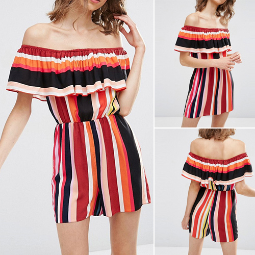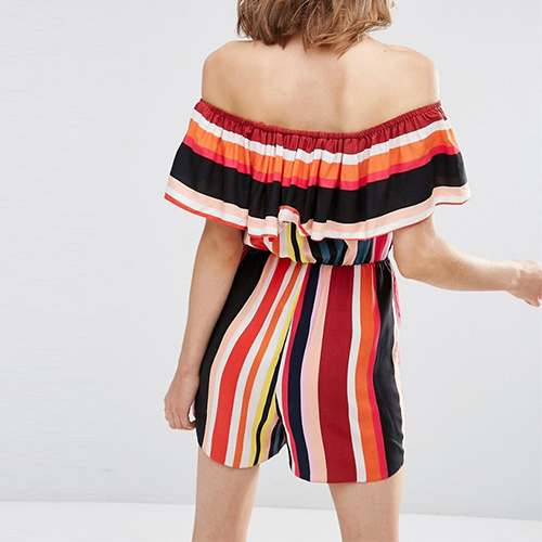 This delicate romper can give you an instantly fashion look. Striped style,its boat neck with off-shoulder and ruffle design