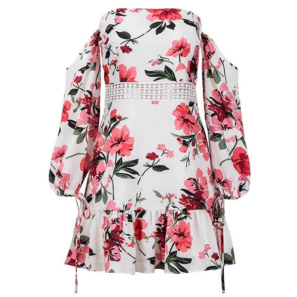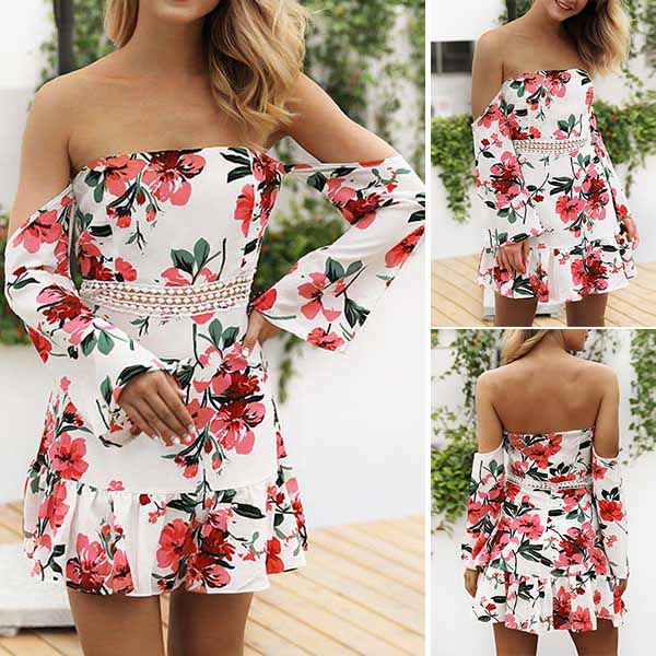 floral print design will help you win more eyes,while the off-shoulder and ruffle hem design can