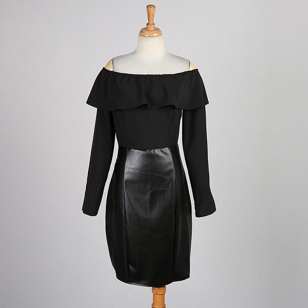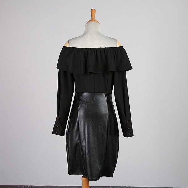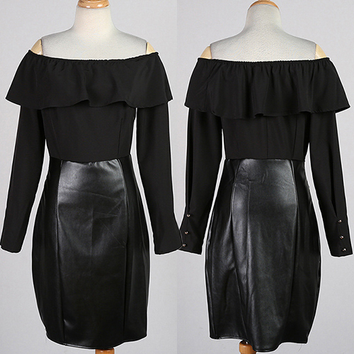 Sexy Off-shoulder Ruffle Long Sleeve PU Spliced Party Dress