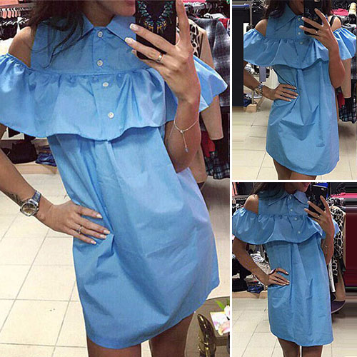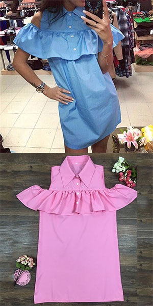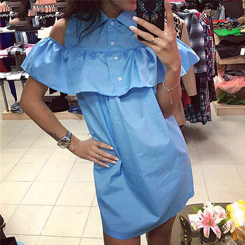 Add a touch of sweet and romantic vibe to your dating night with this shirt dress. Solid color style,its ruffle and off-sholder