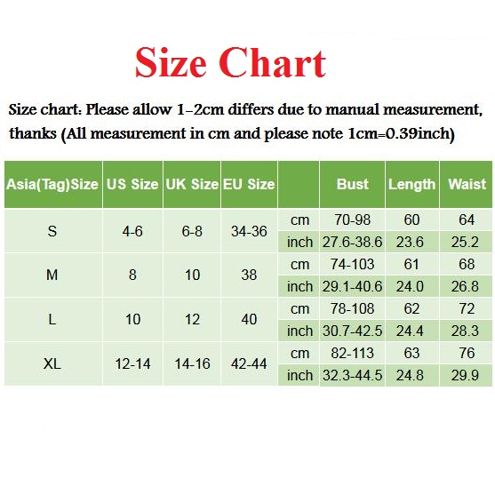 XL : Bust : 82cm - 113cm(32.28" - 44.49"); Waist : 76cm(29.92"); Length : 63cm(24.8");