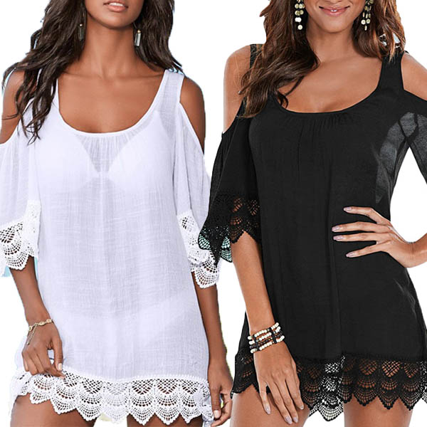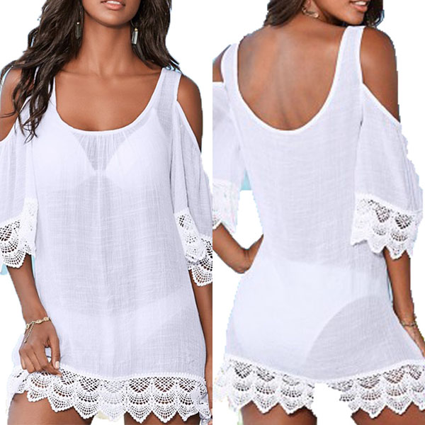 you from the sun,but also can give you a charming beach style. Solid color style,the off-shoulder and lace