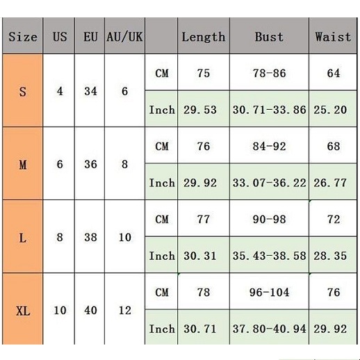 XL : Bust : 96cm - 104cm(37.8" - 40.94"); Waist : 76cm(29.92"); Length : 78cm(30.71");