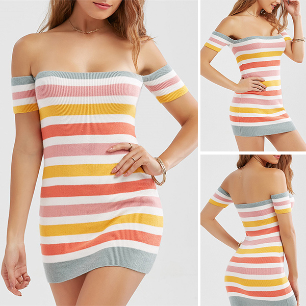 Simple,elegant yet sexy,this is what this knit dress can bring for you. Colorful striped style,finished with short sleeve,