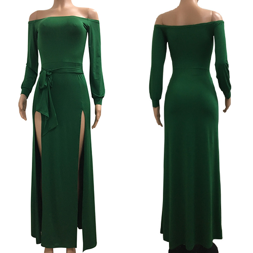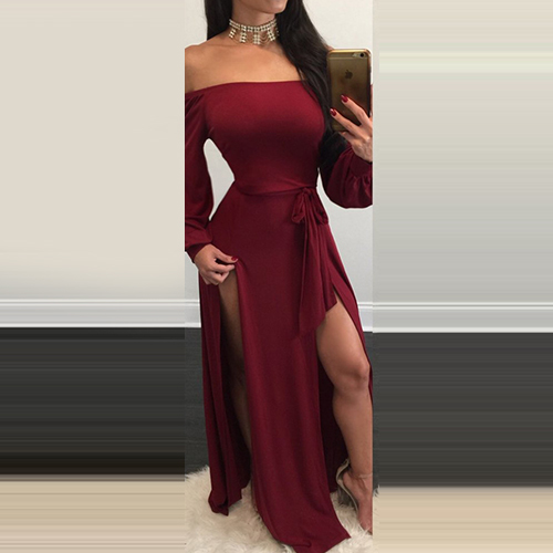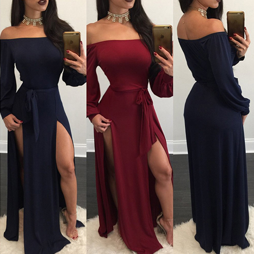 And its off-shoulder wide neckline and high slit hem makes this piece look so sexy and sultry. Adding a sparkle