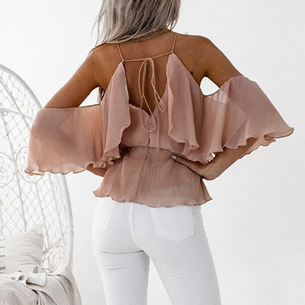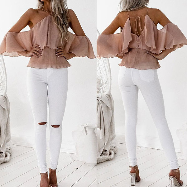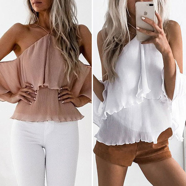 You can have a charming look when you wear this chiffon top. Solid color style,the off-shoulder and ruffle