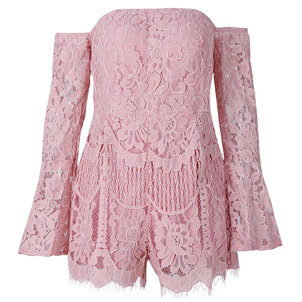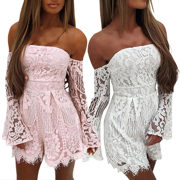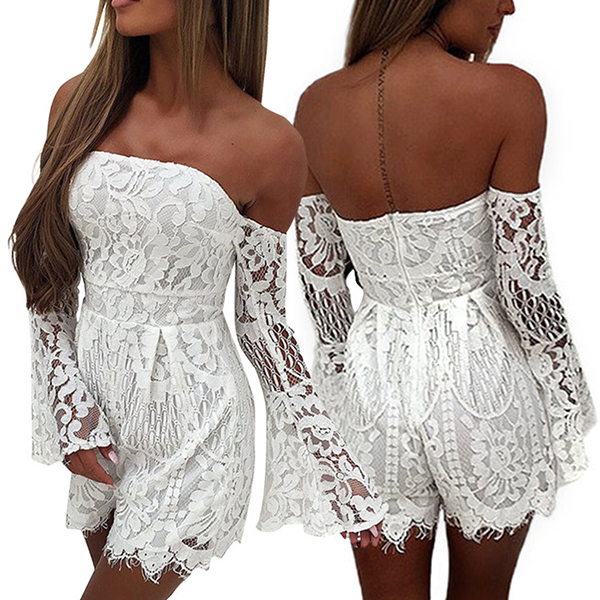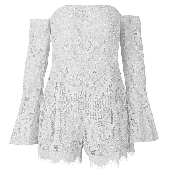 this lace romper! The off-shoulder and trumpet sleeve design will exude your charming female charm,while the